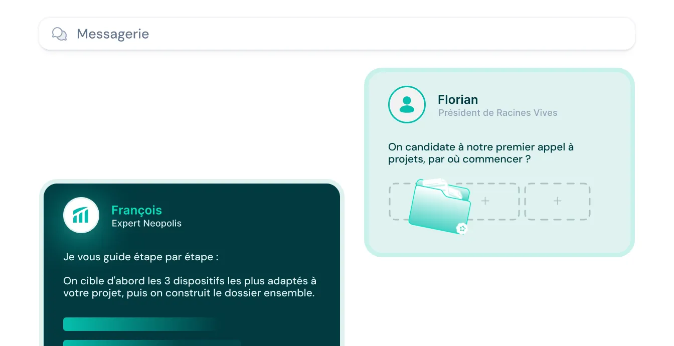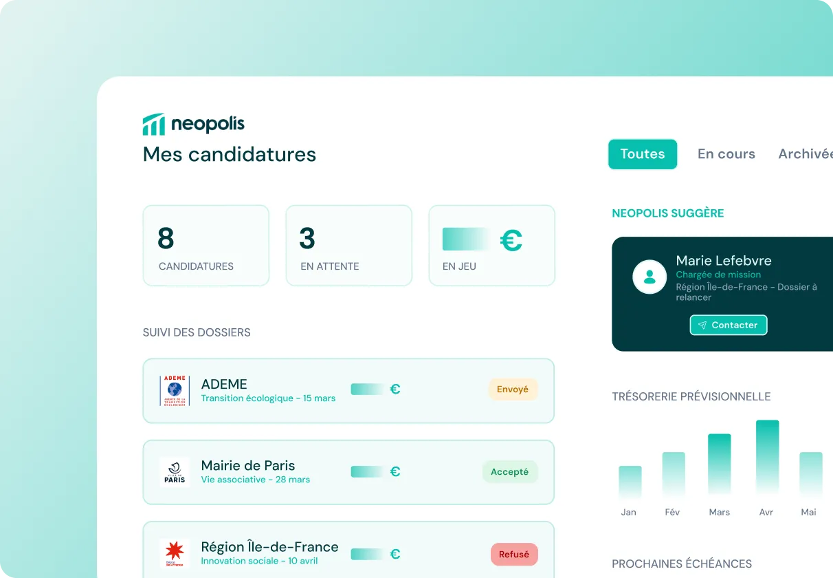 Neopolis repère automatiquement les subventions pertinentes pour vos projets. Et quand il faut passer à l'action, un expert vous guide pour transformer chaque opportunité en financement obtenu.