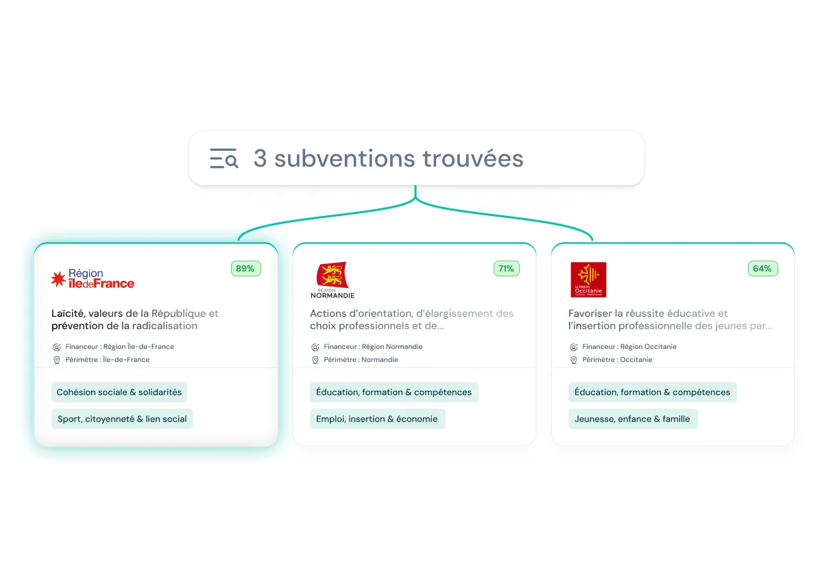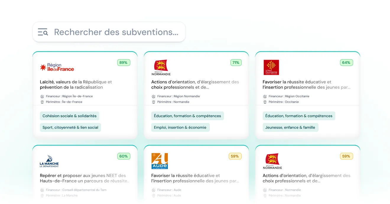 Notre moteur de recherche intelligent scanne en continu les subventions publiques et les financeurs privés pour trouver celles qui vous correspondent.
